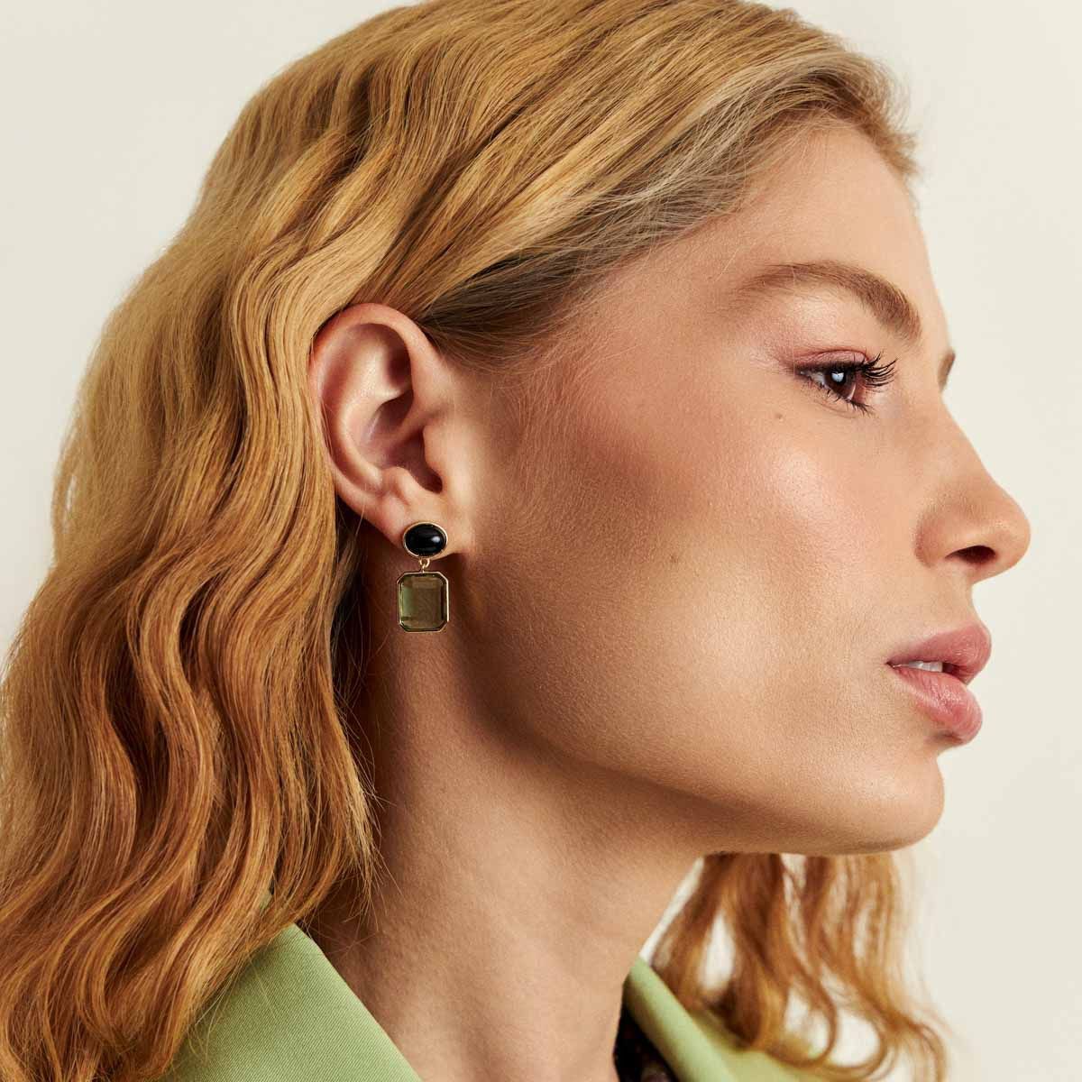Brinco pêndulo de cristal verde com ônix preta