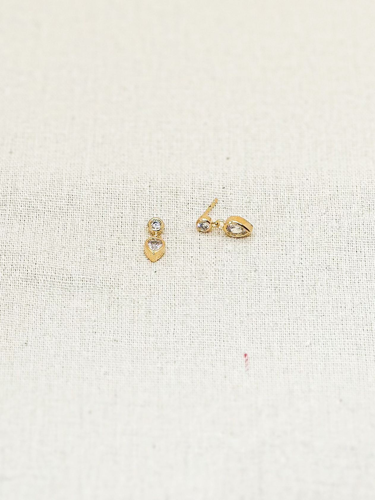 Brinco em banho de ouro 18k, pêndulo de ponto de luz, sendo base zircônia redonda e outra zircônia em formato de gota pendurada. Tamanho: 15mm.