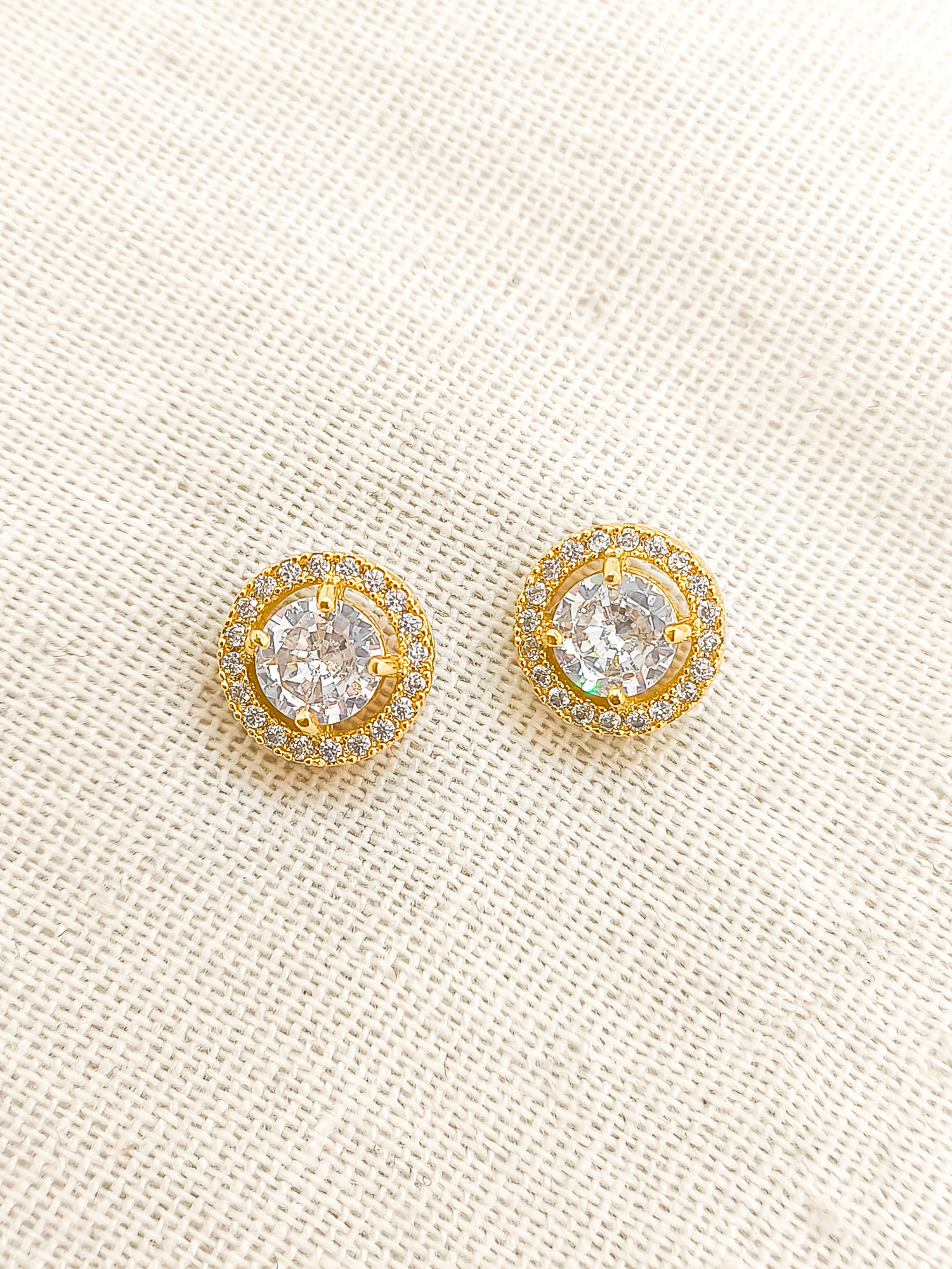 Brinco em banho de ouro 18k, com zircônia 6mm e borda cravejada em microzircônias bramcas. Tamanho: 11mm.