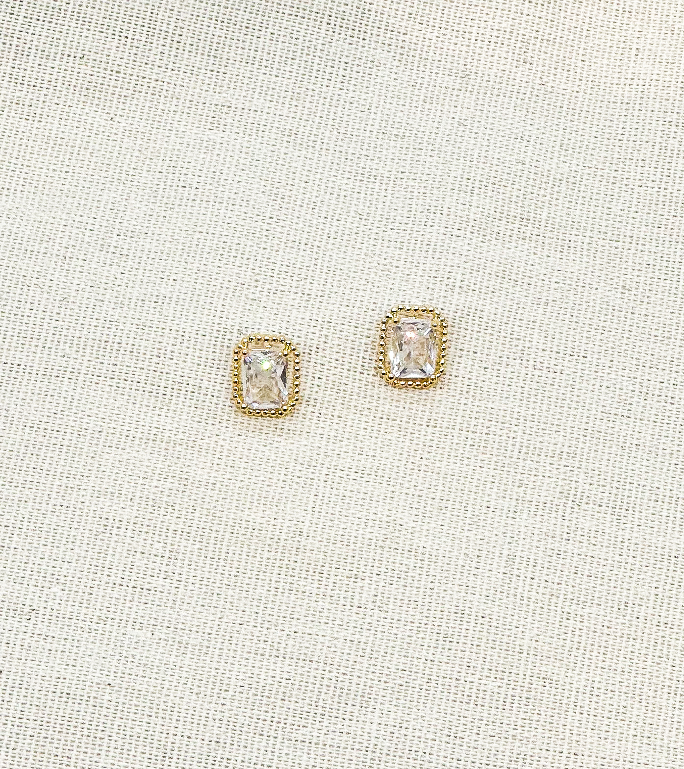 Brinco banho de ouro, com zircônia retangular com borda de bolinhas lisas. Tamanho: 11mm.