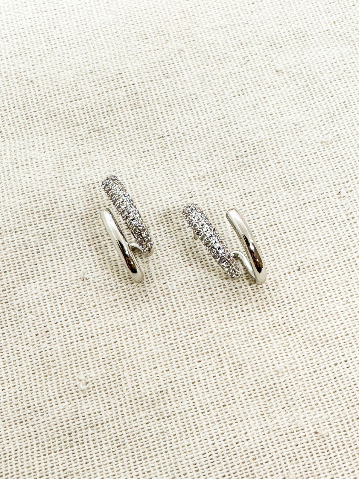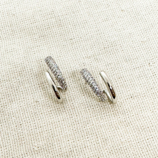 Brinco pino em banho de ródio argola dupla sendo uma lisa e outra cravejada.