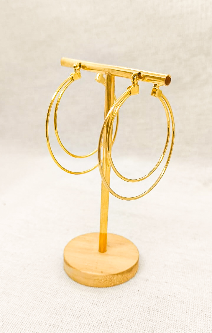 Argola dupla de encaixe em banho de ouro 18k. Altura: 50mm.