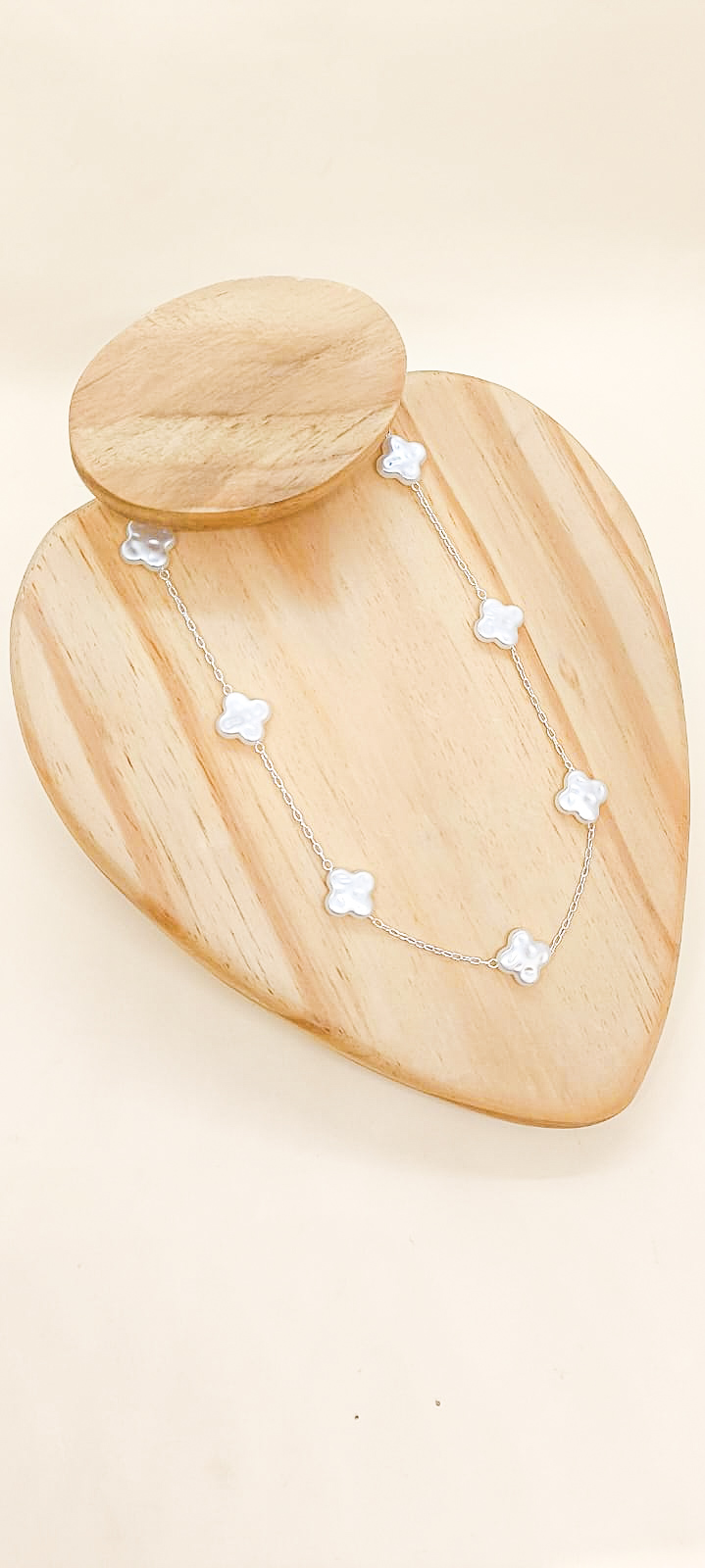 Colar elo americano com pérolas sintéticas em formato de trevo, em prata leve. Tamanho: 40 cm.