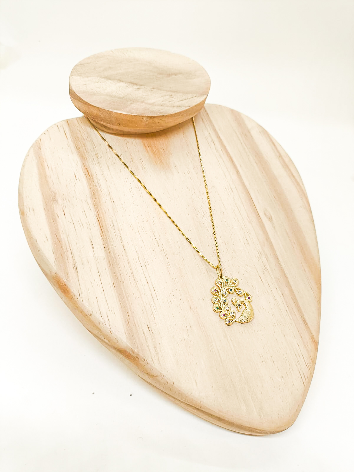 Corrente veneziana 45m com pingente pavão, cravejado com zircônias coloridas.