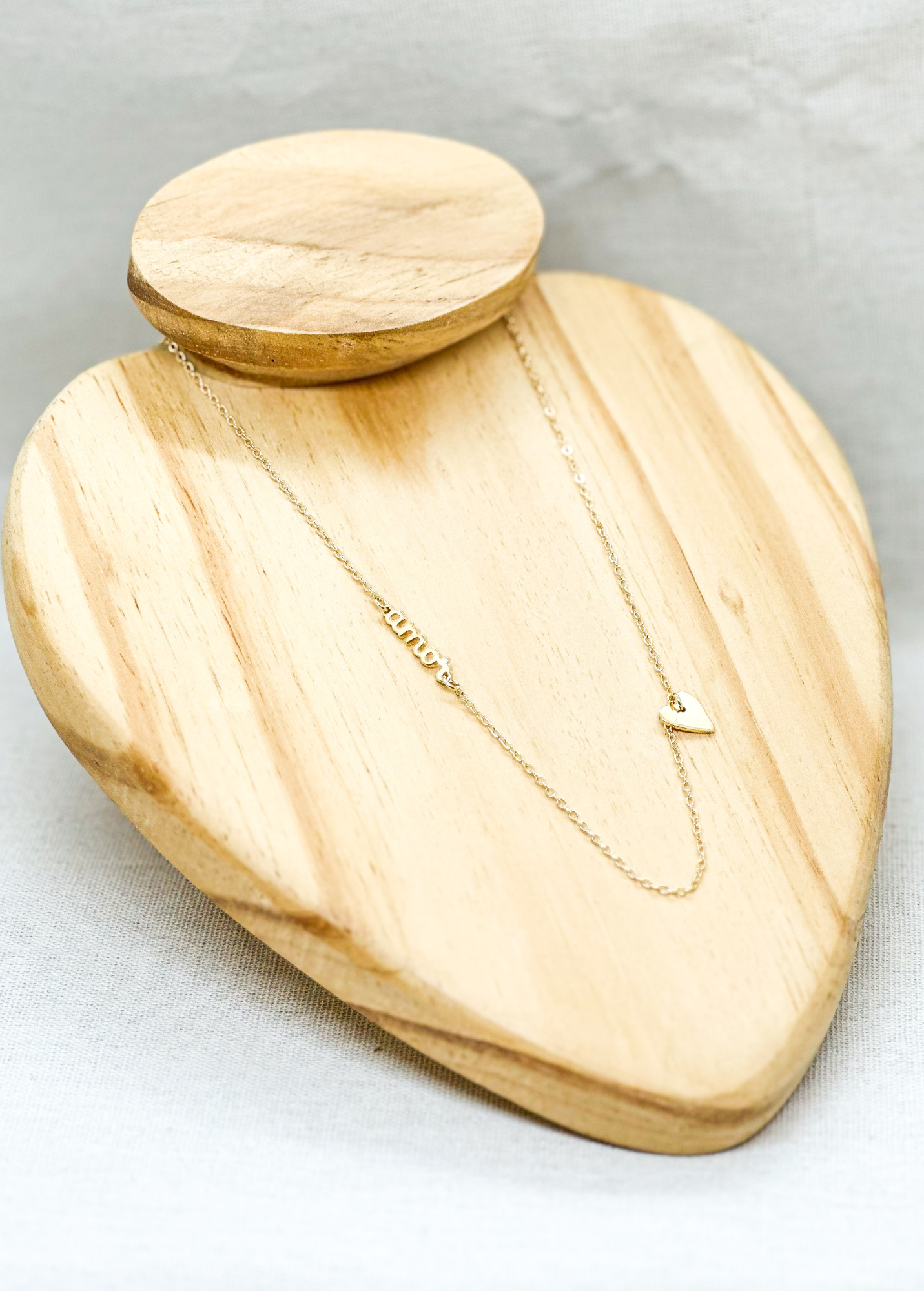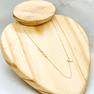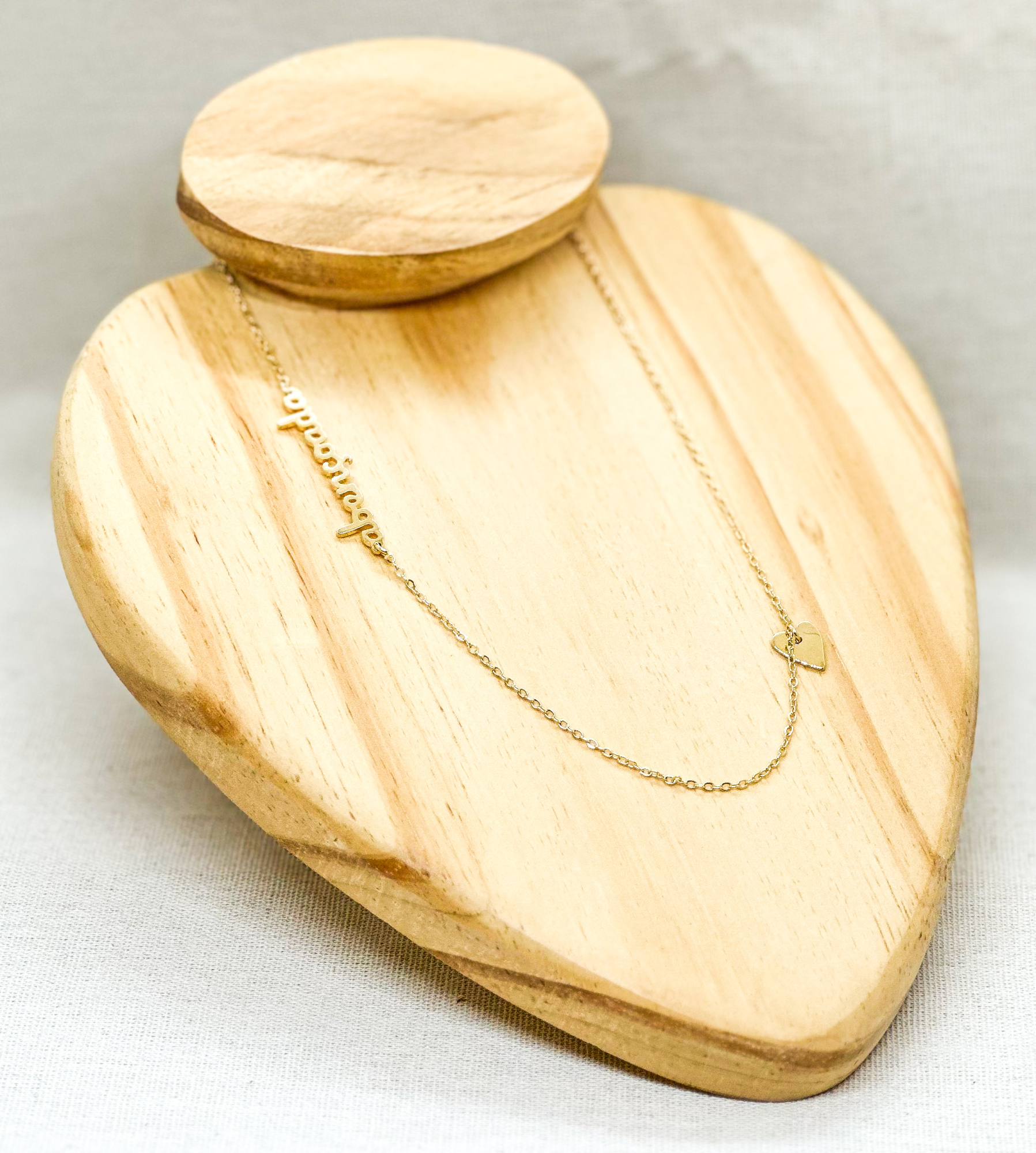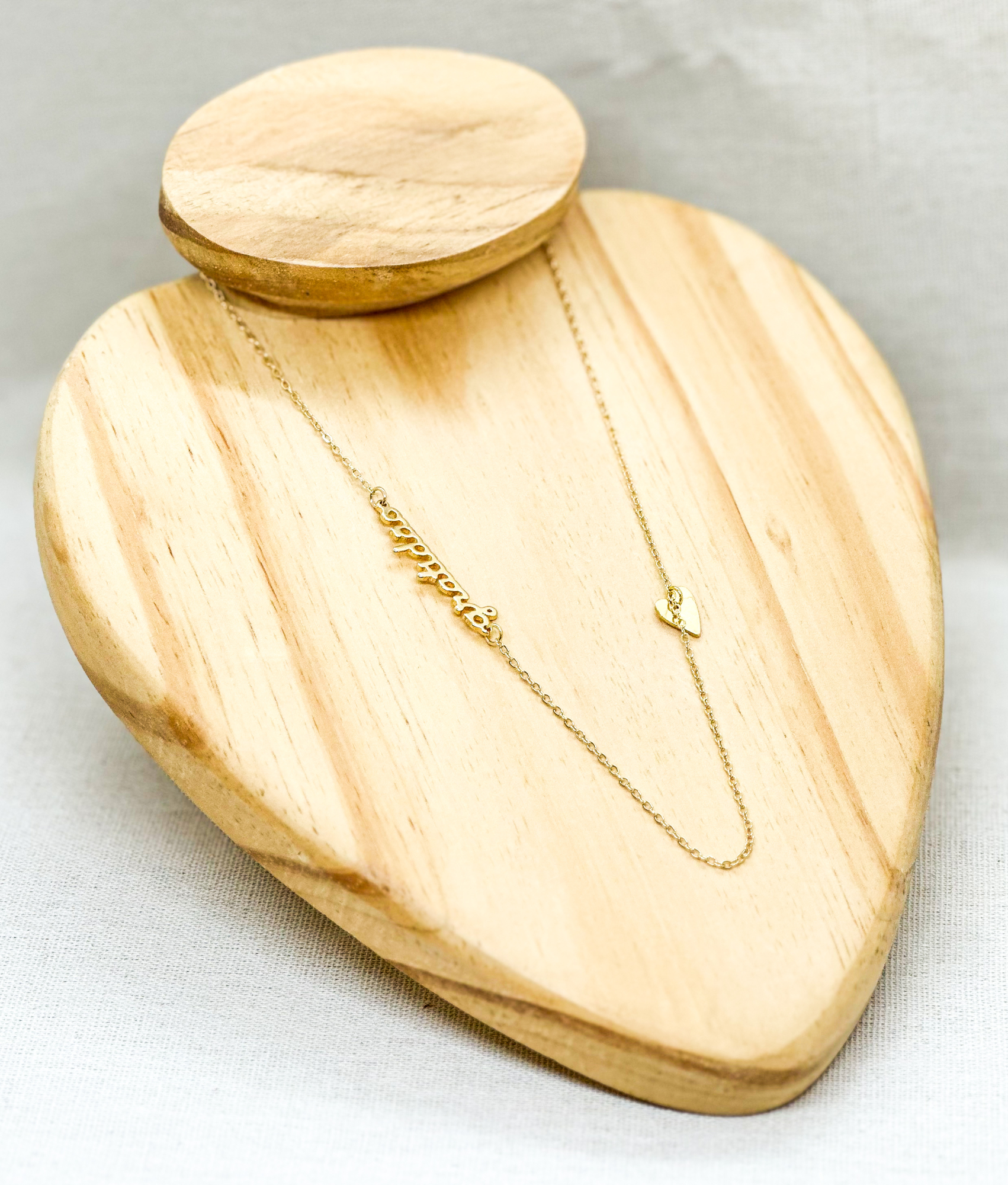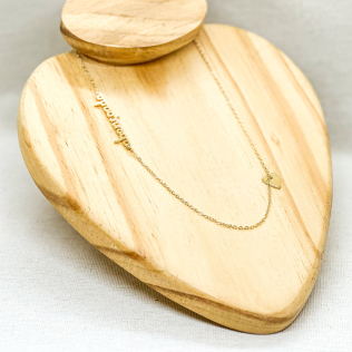 Corrente em banho de ouro 18K, elo americano com escrita em letra cursiva abençoada / Gratidão / Amor e no centro da corrente coração. Tamanho: 45cm com 5cm de extensor.