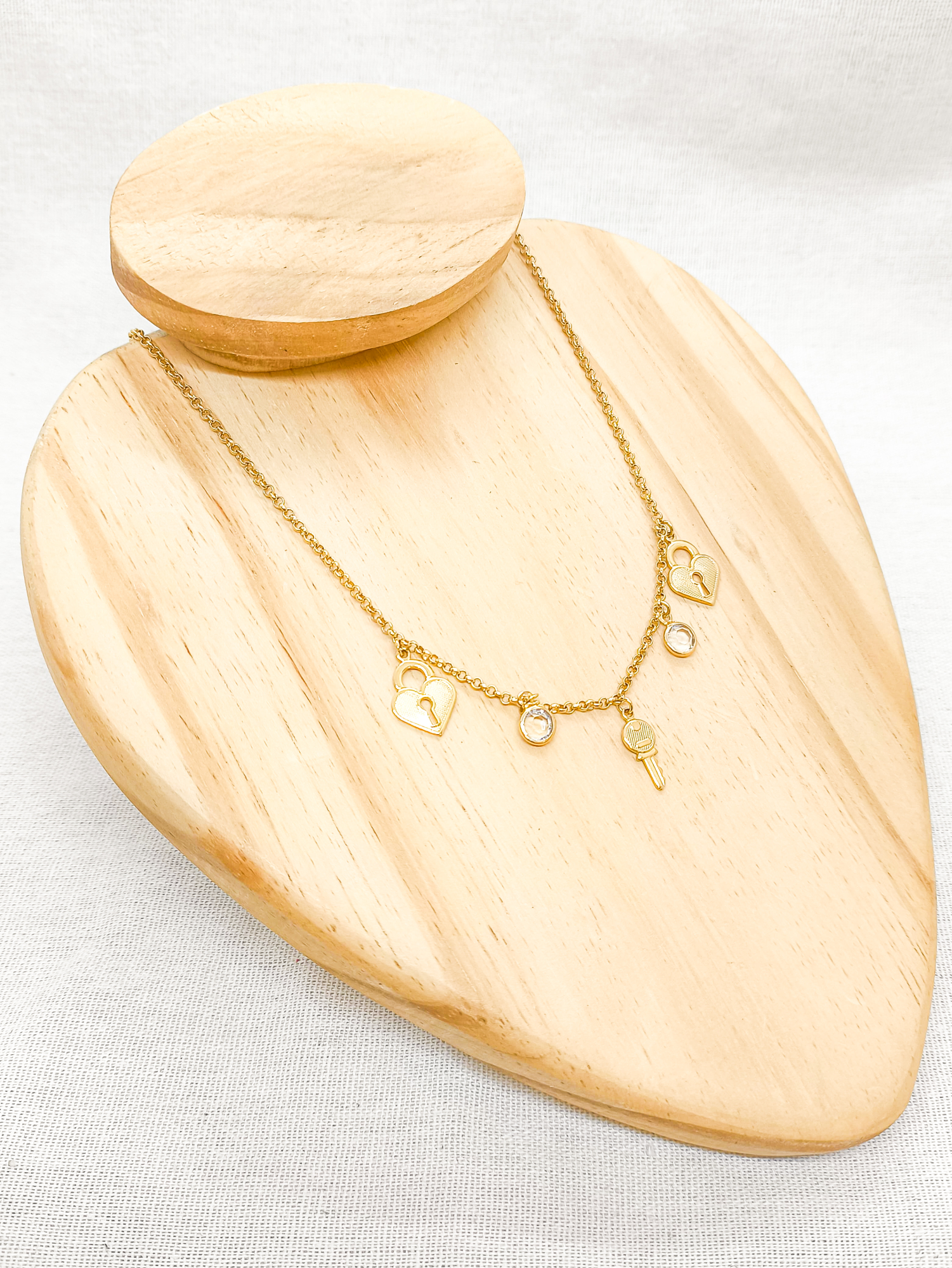 Corrente em banho de ouro 18k, elo português infantil com pingentes de cadeados, ponto de luz em zircônia e chave.