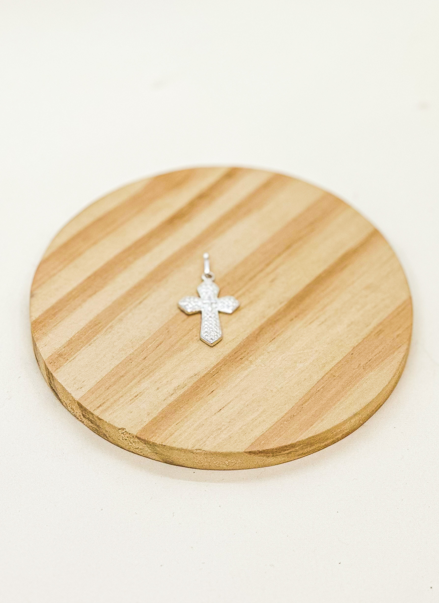 Pingente em prata 925 formato de cruz com texturas. Altura: 30mm. Largura: 25mm.