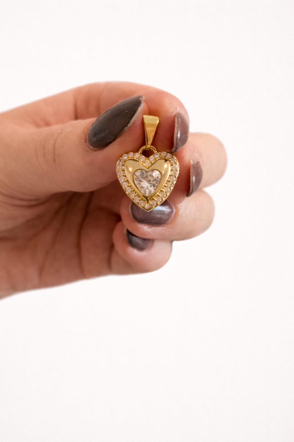 Pingente em banho de Ouro 18K / Prata Leve em formato de coração com zircônia central e borda cravejada. Comprimento - 1,3cm