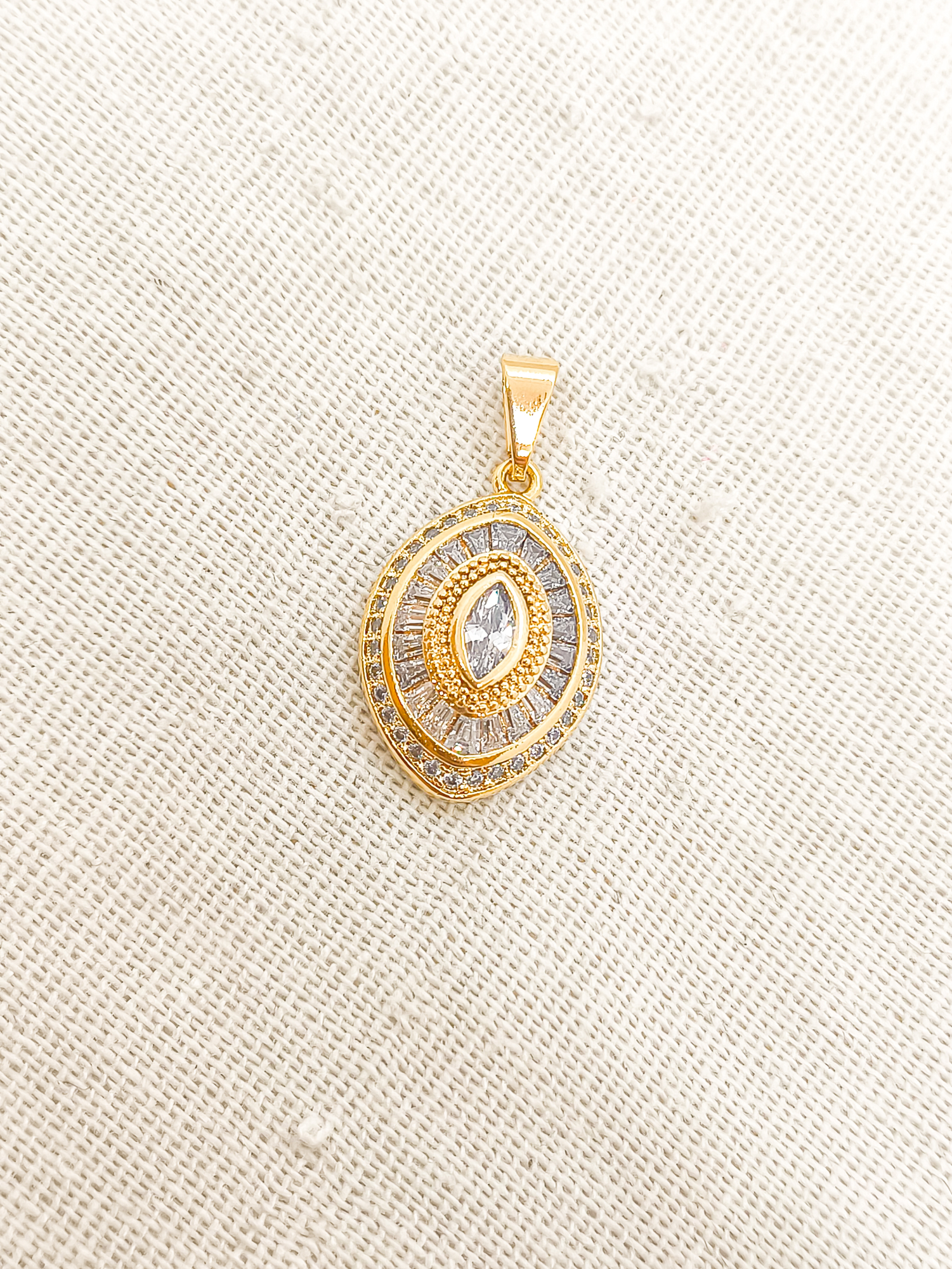 Pingente em banho de ouro 18K com cristais ( zircônia ) baguete, cristal central navete, borda com pontos de luz.