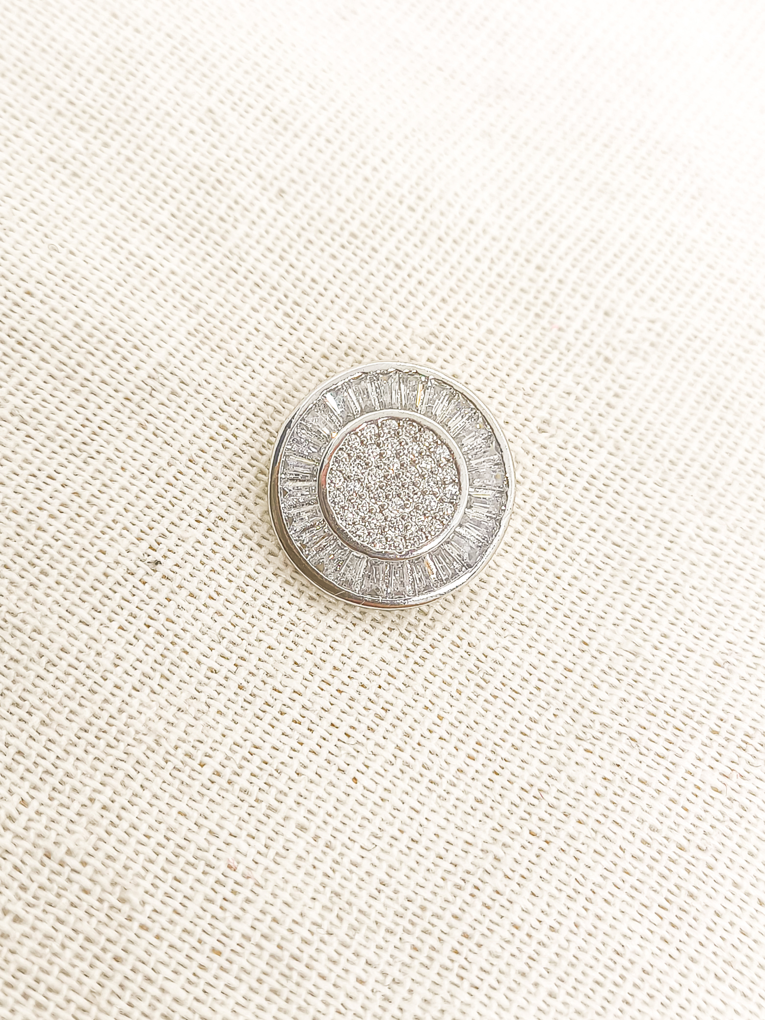 Pingente em banho de ródio branco, modelo de pizza cravejado em zircônias brancas. Tamanho: 1,5 cm de diâmetro.