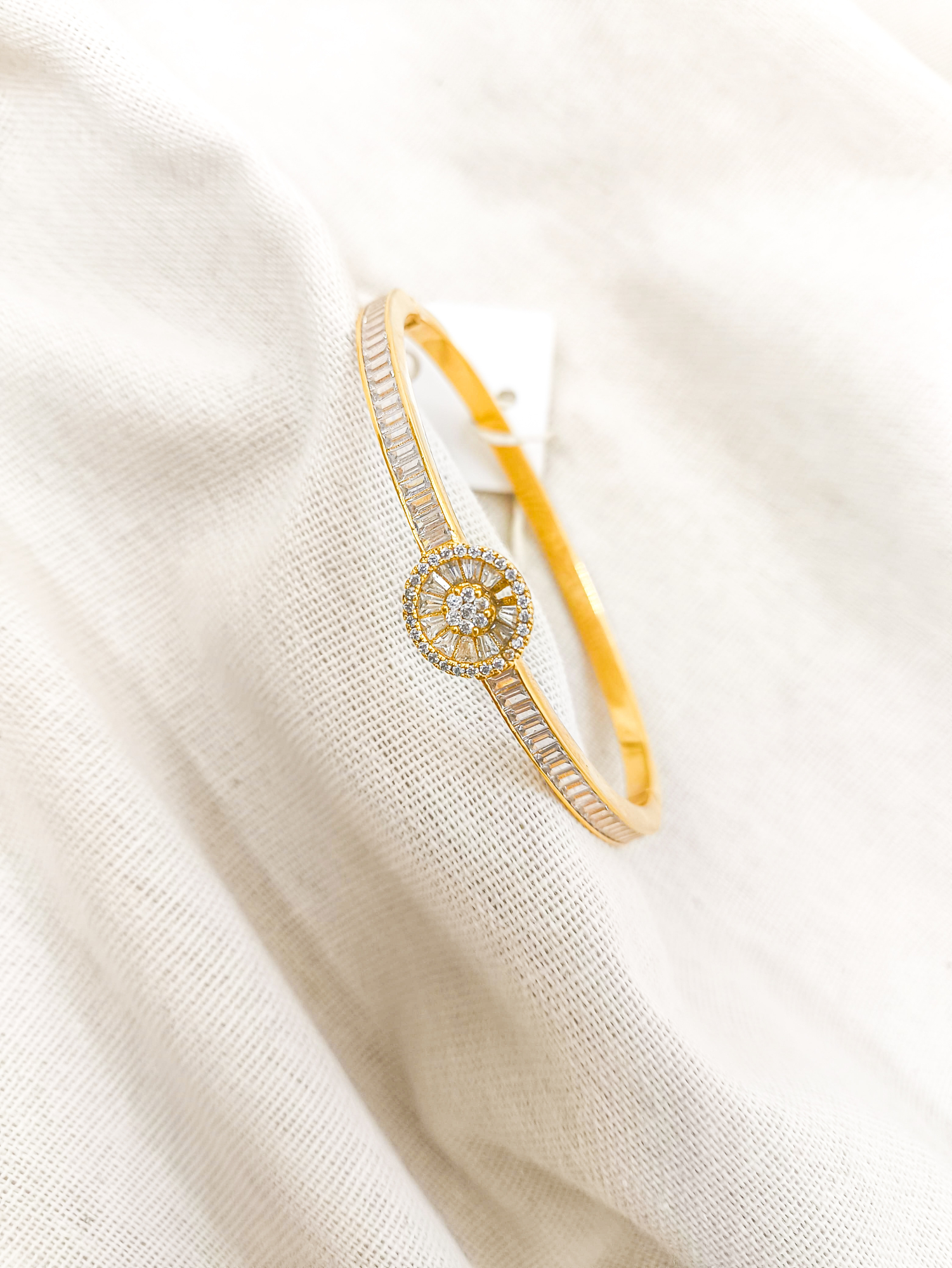 Bracelete em banho de ouro 18k, com fecho click, com zircônia baguete, e detalhe de pizza na frente.