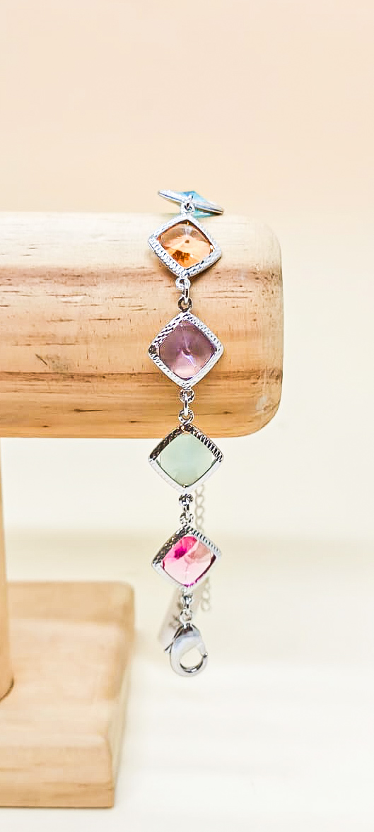 Página Inicial / Pulseiras / Pulseira cristais quadrados coloridos rodinada