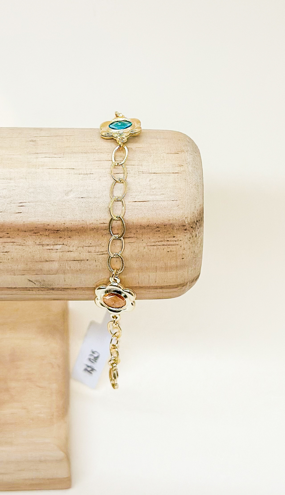 Pulseira em elo americano, banhada em ouro 18k, com 3 flores com miolos de cristais coloridos. Comprimento: 17cm + 5cm de extensor.