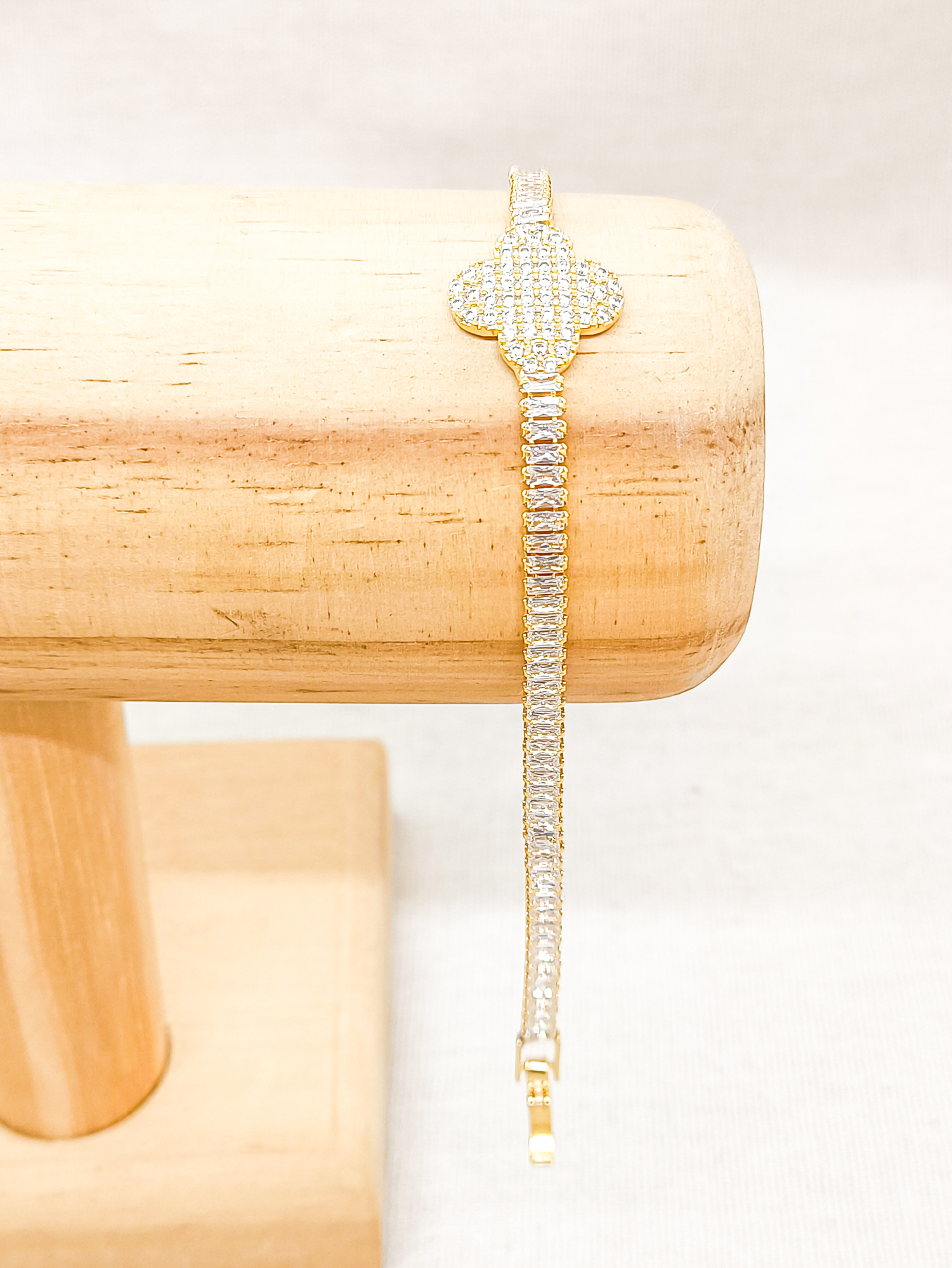 Página Inicial / Pulseiras / Pulseira Riviera Dourada Baguete com Trevo