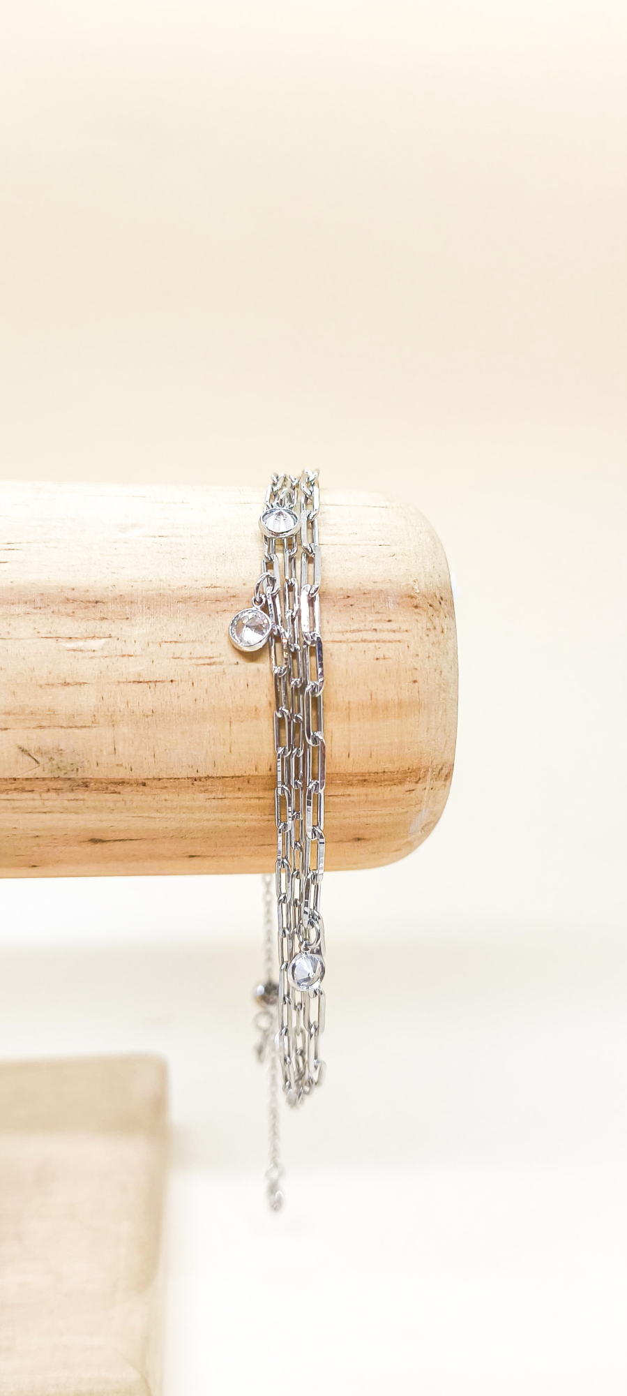 Pulseira em banho de ródio, elo português com 3 fios em malha cartier com pontos de luz.